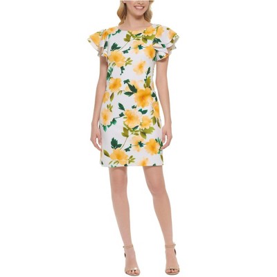 INSPIRE CHIC Women's V-Neck Ruffle Cap Sleeve A-Line Floral Chiffon Dress