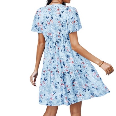 Allegra K Women's Floral Printed Summer Short Sleeve Ruffle Hem Lace Up Cinched Waist Dress