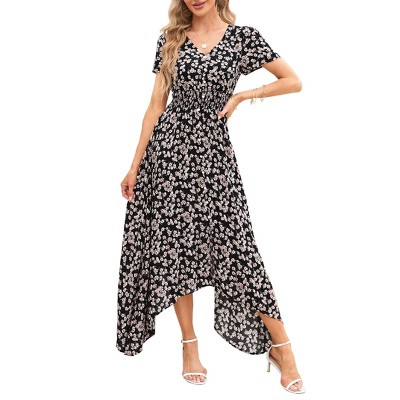 INSPIRE CHIC Women's Floral Smocked Puff Short Sleeves V Neck Ruffled Hem Midi Dress
