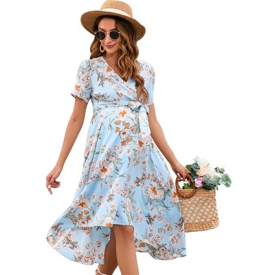Women's Maternity Short Sleeve Ruffle Dress V Neck Casual Flowy Midi Dress