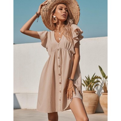 V Neck Ruffle Sleeve Dress, Button Down A Line Casual Mini Dress, Elegant Solid Color Loose Summer Dress for Women