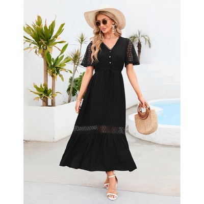 Coolmee Women's Short Sleeve Maxi Dress V Neck High Waist Lace Dress Casual Flowy A Line Beach Dress