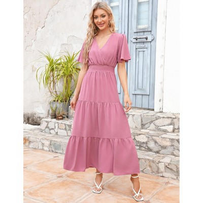 INSPIRE CHIC Women's Smocked Casual Flutter Sleeve V Neck Summer A Line Tiered Midi Dresses