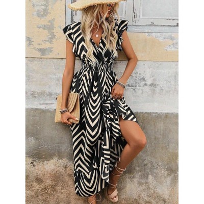 Women's Summer Wrap V Neck Flutter Short Sleeve Maxi Dress Casual Smocked Waist Flowy Tiered ALine Pleated Long Dress