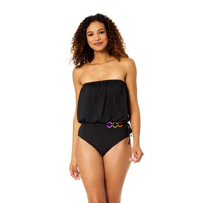 Women's Mod Tropical Black Strapless Belted Ring One Piece Swimsuit