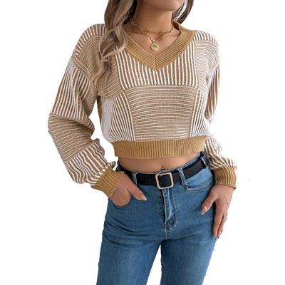 Women's Striped Crop Sweater Oversized Hoodie Bell Long Sleeves Casual Pullover Knit Sweater
