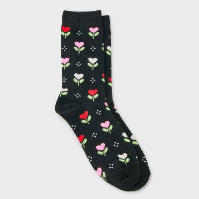 Women's Tulip Hearts Valentine's Day Crew Socks - Black 4-10