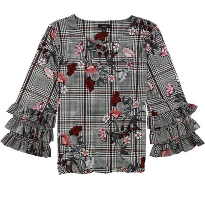 Knit & Lounge Women’s Floral Button Down Top Tie Neck Ruffle Trim Long Sleeve Feminine Flowy Blouse