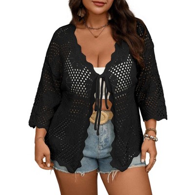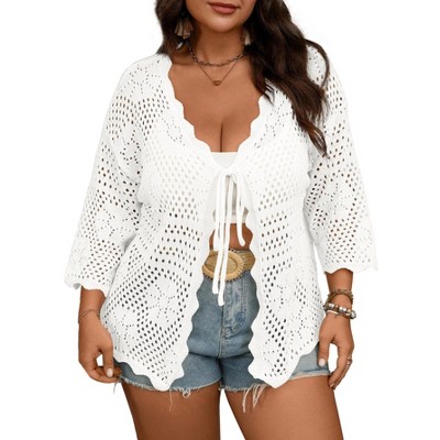 Coolmee Women's Plus Size Fashion Crochet Cardigan V Neck Tie Front Loose Fit Tops Sweaters for Dresses