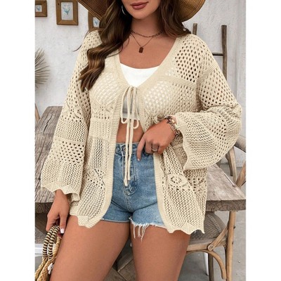 Women Crochet Cardigan Tie Front Long Sleeve Lightweight Cover Up Oversized Hollow Out Summer Cardigans