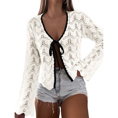 Coolmee Women's Tie Front Cardigan Crochet Sweater Crop Tops Cute Bell Long Sleeve Knit Shrug Beach Vacation Cover Up