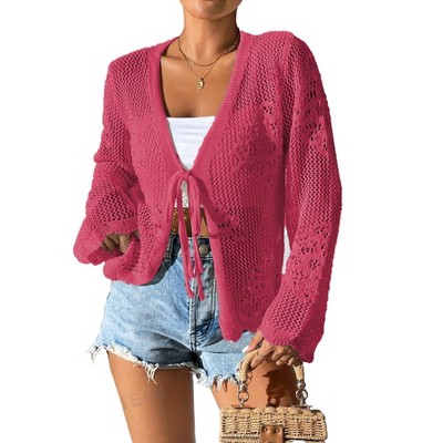 Women's Lightweight Crochet Cardigan Open Front Tie Shrug Knit Crop Top Summer Cardigan