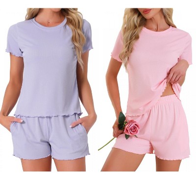 INSPIRE CHIC Women's 4 Pcs Ribbed Knit Soft Short-Sleeve Top & Shorts Ruffled Lounge Pajama Set with Pocket