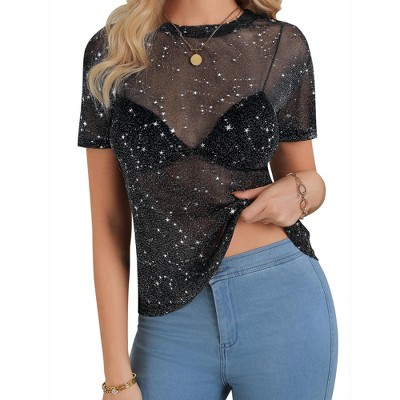 Nlife Women's Sheer Mesh Round Neck See Through Stars Short Sleeve Glitter Clubwear Tops