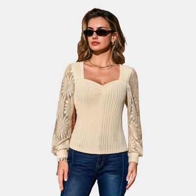 Women's Elegant Floral Mesh Sleeve Ribbed Knit Blouse - Cupshe