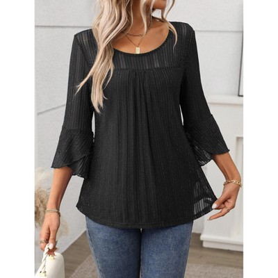 Coolmee Womens Dressy Blouse V Neck Double Layers Elastic Mesh Casual Flowy Work Shirts Ruffle 3/4 Flared Sleeve Tunic Tops