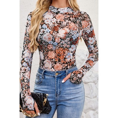 INSPIRE CHIC Women's See Through Mesh Mock Neck Velvet Floral Print Tee Shirt