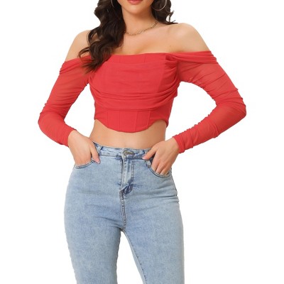 Allegra K Women's Ruched Off Shoulder Push Up Party Mesh Sheer Long Sleeve Corset Crop Top