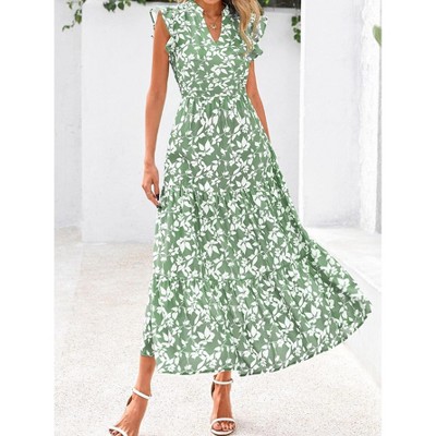 Women's Cross Neck Midi Floral Dress Flying Sleeve Summer Ruffle Pencil Skirt Dress With Waist Belt