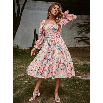 Women's Floral Midi Dress Square Neck Tie Waist Flared Long Sleeve Elegant Dresses