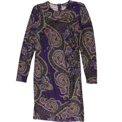 Slickblue Women's Summer Mesh Ruched Midi Dress, Long Sleeve Smock Neck, Tomato/Purple Print, Size S-L