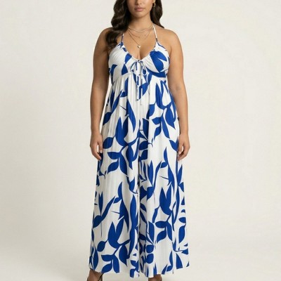 Anna-Kaci Women's Sleeveless Printed Wide Leg Jumpsuit with Halter Neck Tie Front Detail Flowy Relaxed Fit