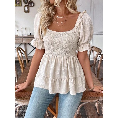 Women's Square Neck Puff Sleeve Peplum Top Textured Smocked Ruffle Casual Blouse