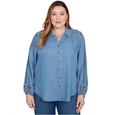 Alfred Dunner Womens Plus-Size Puff Print Pinstripe Embroidered Button Down Top, Blue, Size 2X