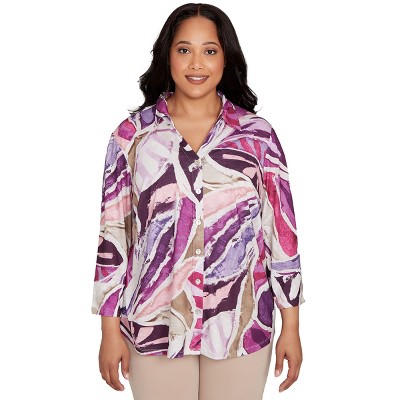Alfred Dunner Womens Plus-Size Stained Glass Floral Print Top With Necklace, Multi Pink, Size 3X