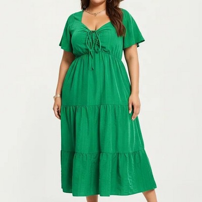 Plus Size Short Sleeve V-neck Tiered Midi Dress