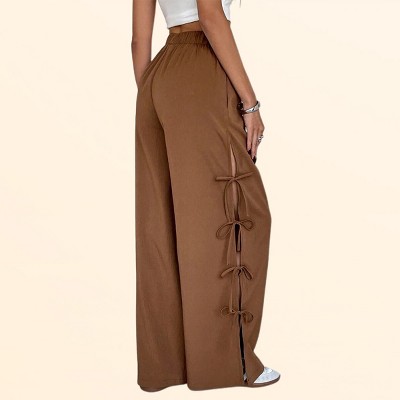 Women's High Waist Casual Drawstring Wide Leg Pants Comfortable Cute Long Pants With Pockets Beige S
