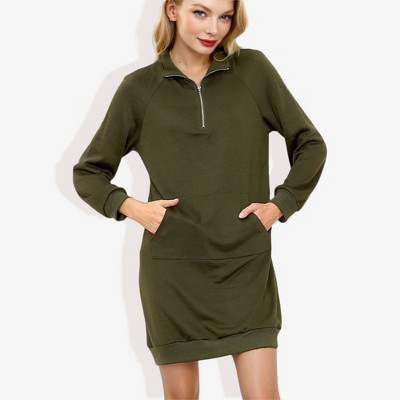 Anna-Kaci Women's Cuffed Solid Kangaroo Pocket Zipper Mini Dress - Small, Dark Green