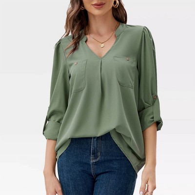 Women's Casual Tops - V Neck Pullover Shirts, Basic Long Sleeve Chiffon Tunic with Adjustable Sleeves for Business Work,Green - S