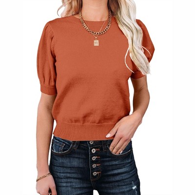 BLUEMING Sweater Tops for Women Short Sleeve Crew Neck Summer Knit Shirt Ribbed Knit Cuff Tops, Orange - M