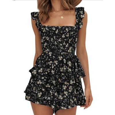Imily Bela Women Floral Square Neck Ruffle Strap Layered Hem Short Jumpsuit Summer Romper