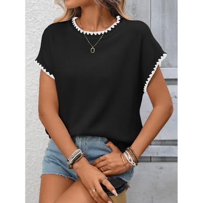 Women's Contrast Trim Sweater Knit Top Crew Neck Dolman Short Sleeve Casual Summer Shirt Blouse