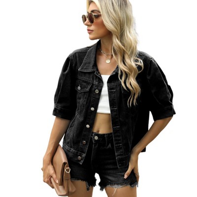 Women's Button Front Collared Short Puff Sleeve Relaxed Fit Casual Cropped Denim Jacket