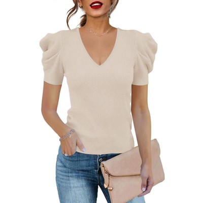 Clearlove Womens Summer Shirt V Neck Puff Sleeve Tops Summer Spring Casual Tshirts