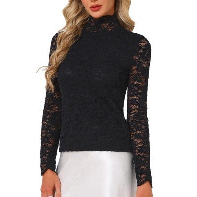 INSPIRE CHIC Women's See-Through Stretch Smocked High-Neck Long-Sleeve Lace Floral Blouse