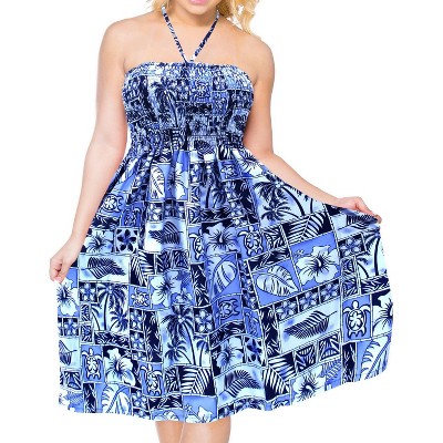 LA LEELA Womens House Daily Routine Evening Wear Boho Halter Smocked Mini Swing Casual Dress Tube Top Strapless for Women One Size Blue, Floral