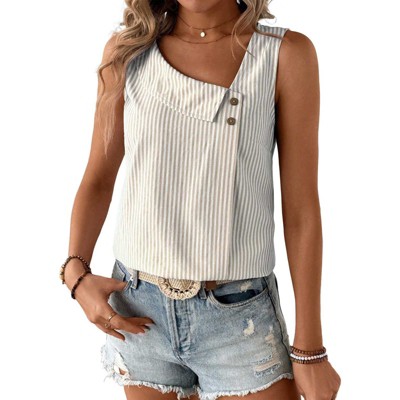 Casual Asymmetrical Neck Sleeveless Top for Women, Striped Button-Detail Tank T-Shirt