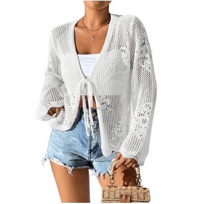 Women Crochet Cardigan Tie Front Long Sleeve Lightweight Cover Up Oversized Hollow Out Summer Cardigans