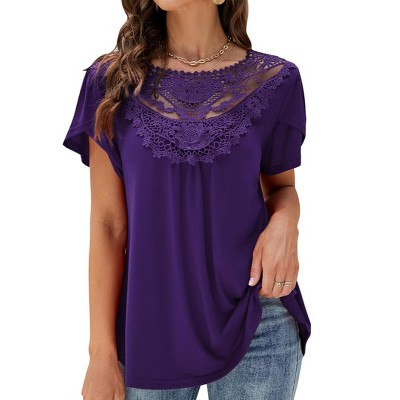 Women's Summer Shirts Lace Trim Round Neck Short Sleeve Lightweight Blouses Tunic Tops
