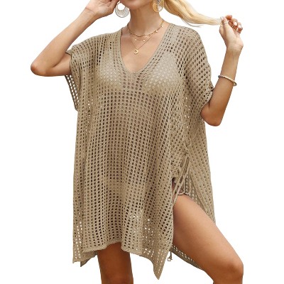 Coolmee Women Swimsuit Crochet Swim Cover Up High Slit Summer Bathing Suit Swimwear V Neck Mesh Knit Beach Dress Vacation Outfits