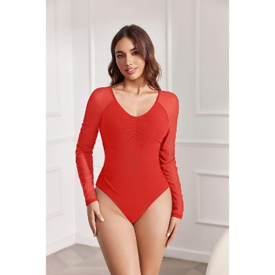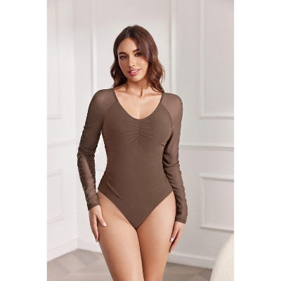 Avidlove Long Sleeve Bodysuit for Women V Neck Mesh Ruched Shapewear Body Suits Going Out Leotard Tops
