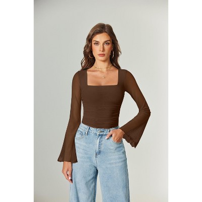 Avidlove Bodysuits for Women Long Bell Sleeve Mesh Square Neck Body Suits Going Out Ruched Bodysuit Tops Concert Outfits