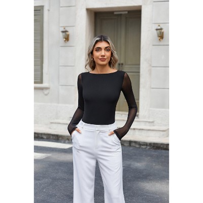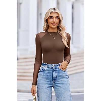 Avidlove Long Sleeve Bodysuits for Women Mock Neck Sheer Mesh Sleeve Bodysuit Double Lined Leotards Shirt Going Out Top
