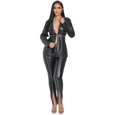 Slickblue Women's PU Leather Zipper Pant Set with Detachable Blazer, Two-Way Wear, Beige or Black, Size S-L