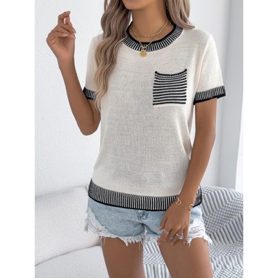 BLUEMING Womens Color Block Stripe Short Sleeve Knit T-Shirts Lightweight Casual Crew Neck Dressy Work Tops