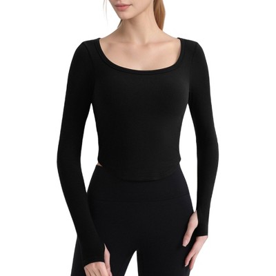 Anna-Kaci Active Women's Long Sleeve Square Neck Cropped Activewear Top with Fitted Design - Small, Black